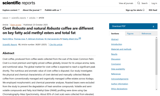 ジャコウネコのうんちから取れる最高級コーヒー豆「コピ・ルアク」は化学的に他の豆と異なることが判明