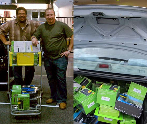 当時のBackblazeはHDDをメインにシステムを構築しており、合計50TBを超えるHDDを毎日増設していました。しかし、タイの洪水に伴って購入対象のHDDが数倍の価格になってしまいました。社員が集まって対策を検討した結果、大手小売店のコストコとベストバイでは3TBの外付けHDDが内蔵HDDと比べて100ドル(約1万500円)安く売られていることが判明し、社員たちで手分けして外付けHDDを買いに行くことに決定しました。以下はコストコで3TBの外付けHDDを52台購入した際の記念写真です。