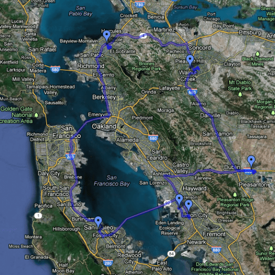 ところが、HDD不足な長引いた結果、2011年11月中旬からコストコなどの小売店でも「HDDは1人2台まで」という購入制限が始まりました。そこでBackblazeは5人で1日3店舗を巡り、1週間で210台を購入するという見積もりを立てました。品切れの店舗もあったため見積もり通りにはいきませんでしたが、諦めずに小売店を巡り続けたとのこと。以下はある日の終業後のHDD購入ドライブの軌跡を示したものです。サンフランシスコ湾を一周してコストコとベストバイを10店舗巡り、46台のHDDを買うことに成功。走行距離は約340kmに達したそうです。