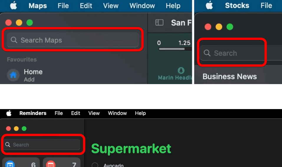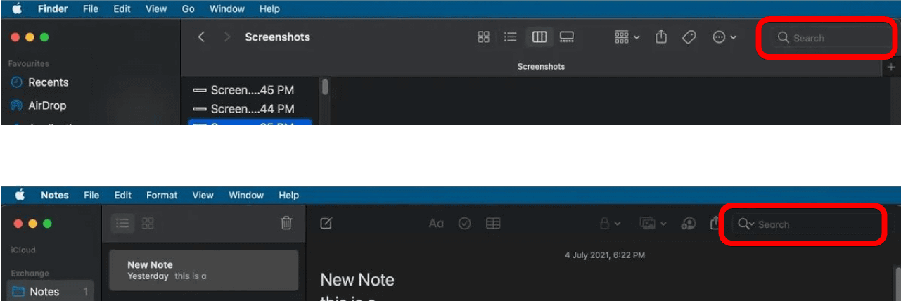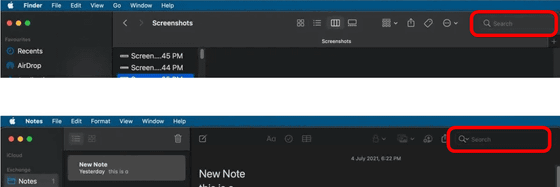 また、アプリによって検索バーの配置が統一されておらず、ユーザーはまず検索バーの場所を探す必要があります。たとえば、「Finder」や「メモ」では右上に検索バーがあります。