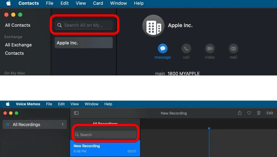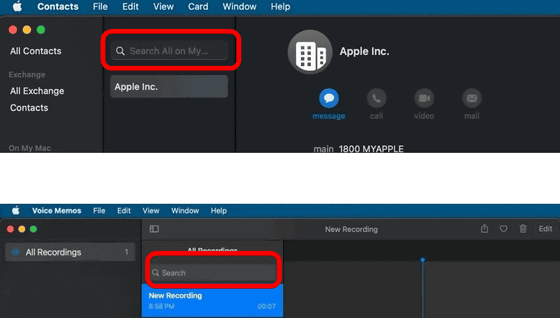 さらに「連絡先」や「ボイスメモ」では中央ペインの上部といったように、検索バーの位置が異なります。