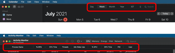 また、「カレンダー」「アクティビティモニタ」などのようにヘッダーまたはタイトルバーに表示されるタブのデザインが異なるケースも。