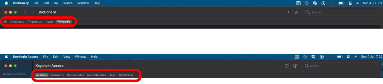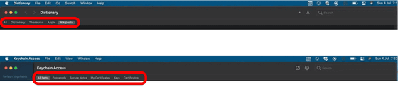 また、macOS 26では、タブに標準的で一貫したデザインがありません。「辞書」や「キーチェーンアクセス」では上部バーの下の別の行に小さなフォントでタブが表示されます。