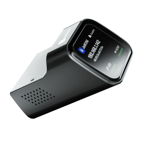 正面にはディスプレイが配置されており、左上にはJetKVMのロゴ、右上にはアクティブな接続の数、中央にはデバイスのIPアドレスとMACアドレス、左下にはUSBケーブルのステータス、右下にはHDMIケーブルのステータスが表示されます。
