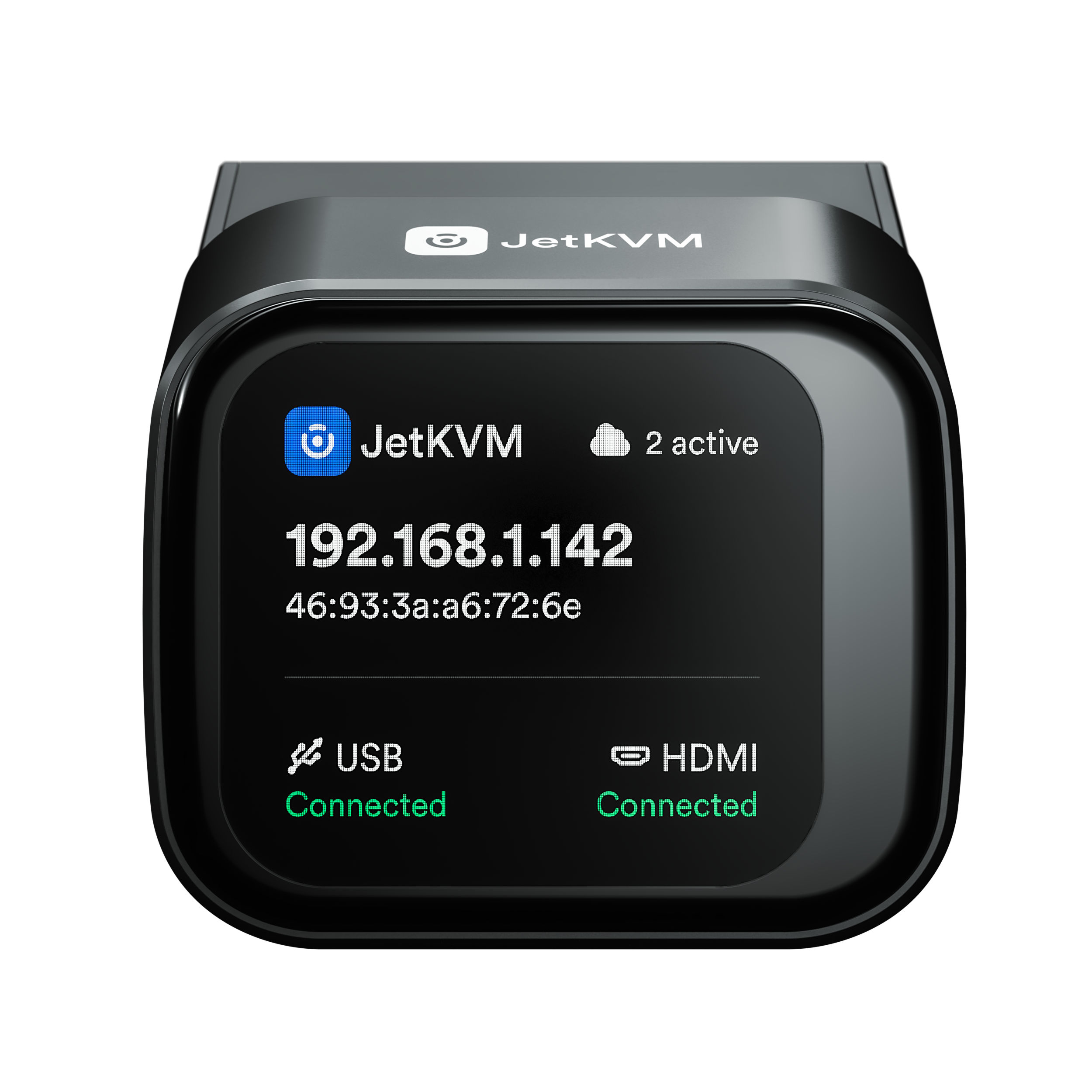 正面にはディスプレイが配置されており、左上にはJetKVMのロゴ、右上にはアクティブな接続の数、中央にはデバイスのIPアドレスとMACアドレス、左下にはUSBケーブルのステータス、右下にはHDMIケーブルのステータスが表示されます。