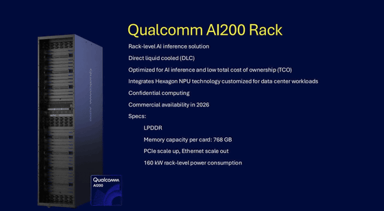 AI200もAI250もチップ単体ではなく、冷却装置や電源もすべて1つのラックに収めたラックソリューションという形で発表されました。熱効率のための直接液冷、スケールアップのためのPCle、スケールアウトのためのイーサネット、および安全なAIワークロードのための機密コンピューティングを特徴とし、ラック単位の消費電力は160kWです。