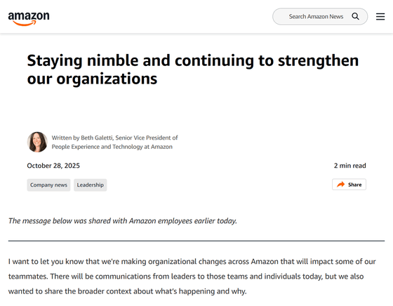 ガレッティ氏は「業績が好調なのに、なぜ人員を削減するのかと疑問に思う人もいるかもしれません。我々は事業全体で日々素晴らしい顧客体験を提供し、急速にイノベーションを起こし、力強い業績を上げています。我々が忘れてはならないのは、世界が急速に変化しているという点です。現代のAIは、インターネット登場以来、最も変革をもたらしている技術であり、企業はかつてないほど迅速にイノベーションを起こすことができます。顧客と事業のために可能な限り迅速に行動するためには、よりスリムで階層を減らし、オーナーシップを高めた組織にする必要があると確信しています」と述べ、今回の人員削減がAIによる影響であることを示唆しました。