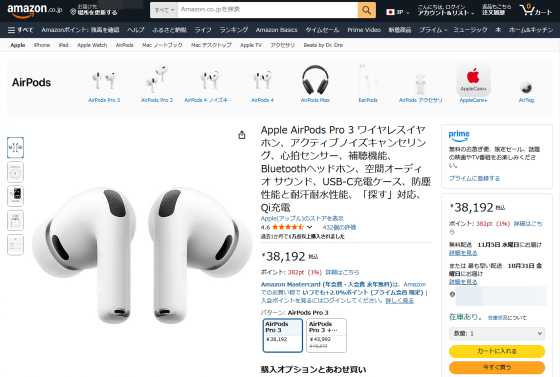 AirPods Pro 3はAmazon.co.jpでは3万8192円で入手可能です。