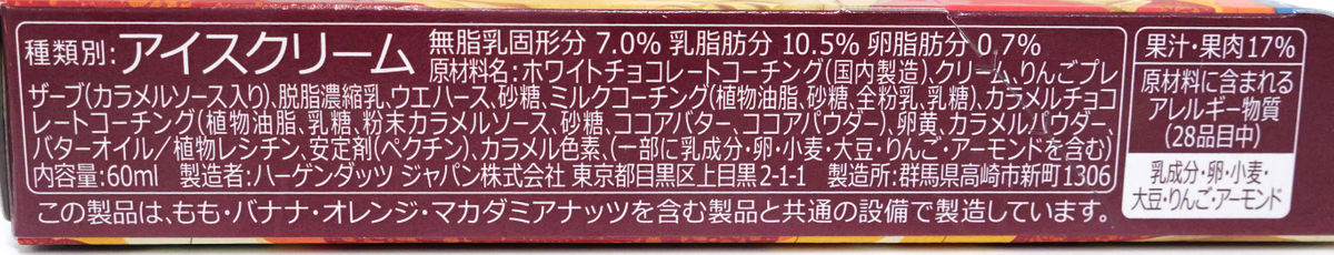 原材料はホワイトチョコレートコーチング、りんごプレザーブ、カラメルチョコレートコーチングなど。