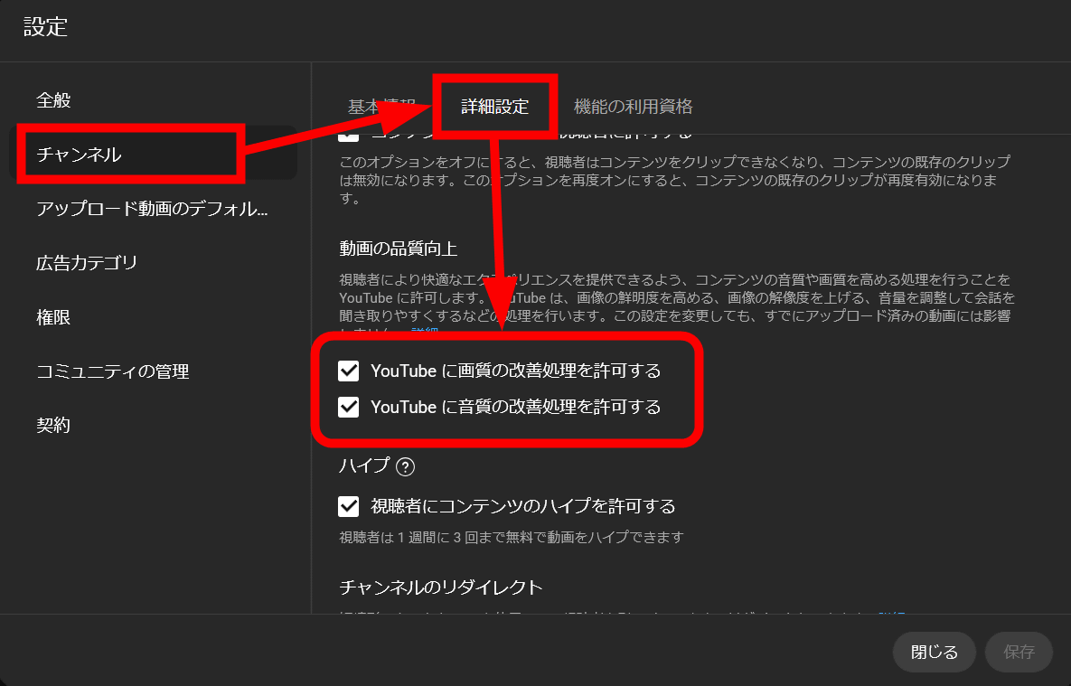 「チャンネル」→「詳細設定」の順にクリックすることで、「YouTubeに画質の改善処理を許可する」および「YouTubeに音質の改善処理を許可する」のオンオフが可能です。なお、デフォルトではYouTubeによる画質および音質の改善処理が有効になっていました。