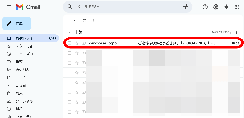 返信が「△△△@gmail.com」の受信箱に届きました。