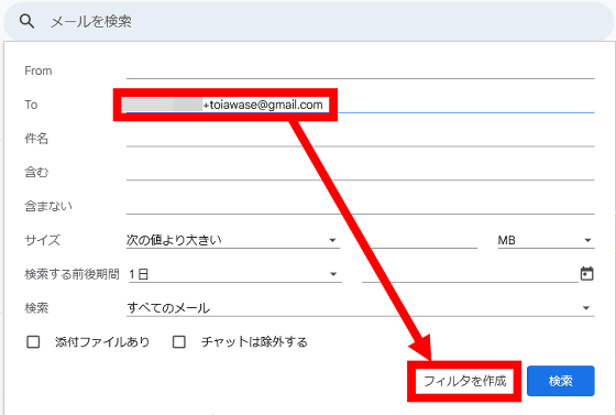 「To」の入力欄に「△△△[email protected]」と入力して「フィルタを作成」をクリック。