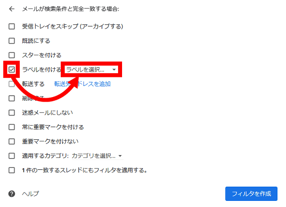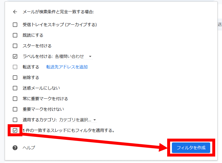 これまで受信したメールも振り分け対象としたいので、「□件の一致するスレッドにもフィルタを適用する」にチェックを入れて「フィルタを作成」をクリック。