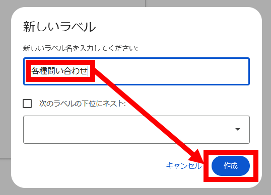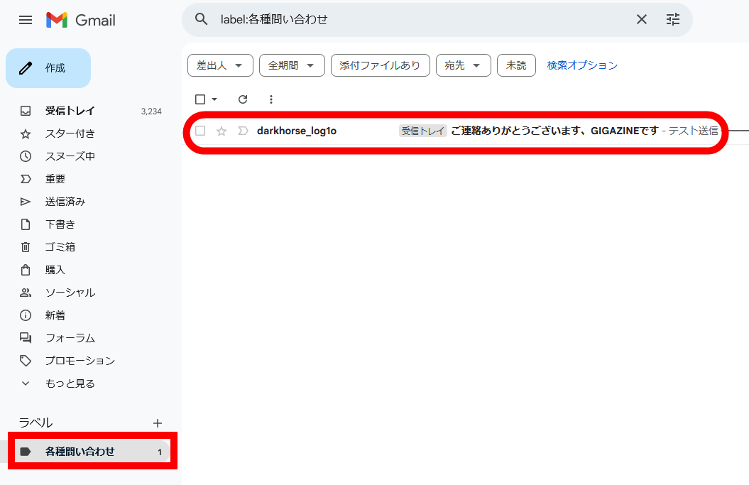 これで、「△△△[email protected]」宛に届いたメールに自動的に「各種問い合わせ」というラベルが付与されるようになりました。後は、サイドバー内の「各種問い合わせ」をクリックすれば絞り込み済みのメールを閲覧できます。