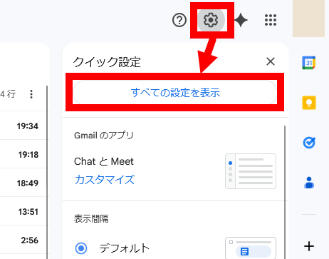 エイリアスを使ってメールを送信するには設定が必要です。まず、画面右上の設定ボタンをクリックしてから「すべての設定を表示」をクリック。
