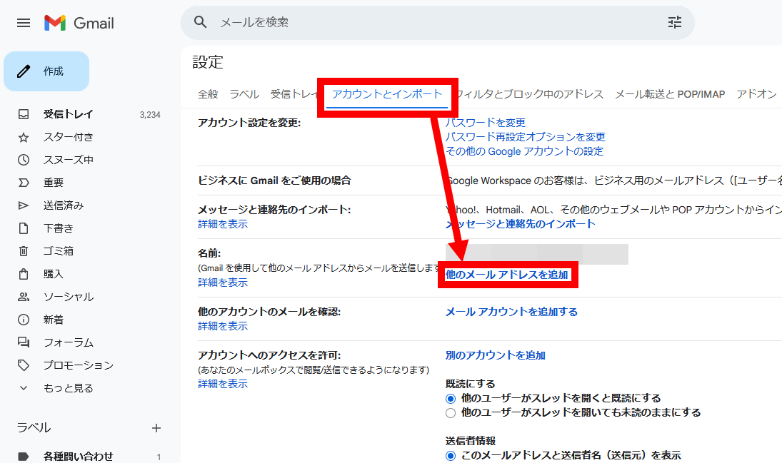 「アカウントとインポート」をクリックしてから「他のメールアドレスを追加」をクリック。