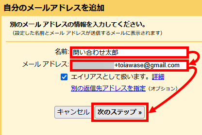 「名前」の入力欄にメール送信時に使う名前を入力し、「メールアドレス」の入力欄にエイリアスを入力してから「次のステップ」をクリック。