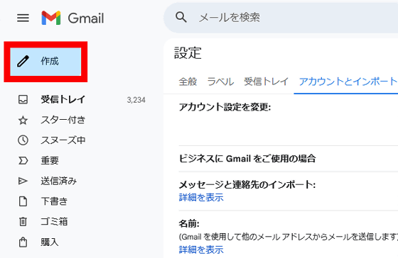メール作成時の操作は次の通り。まず、「作成」をクリック。