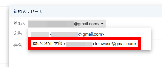 メールアドレス候補が表示されるので、使いたいメールアドレスをクリックすれば、後は普段のメール作成と同じ操作でメールを送信できます。