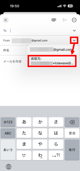 スマートフォンアプリ版のGmailの場合、メール作成画面の「From」の右側にあるボタンをタップすると送信用メールアドレスを選択できます。ただし、あらかじめウェブアプリ版のGmailで上記の設定をしておく必要があります。