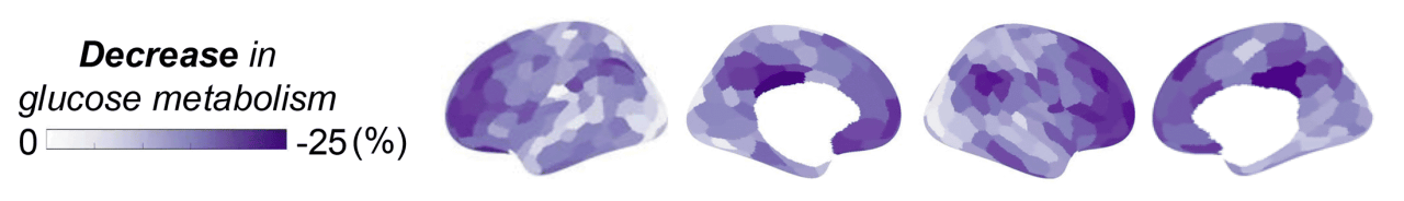 グルコース代謝の減少したところを色濃くするとこのようになります。