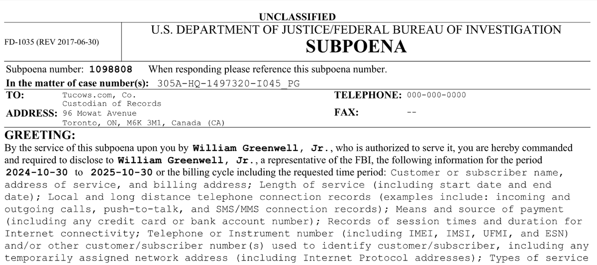 投稿にリンクされているPDFファイルは、FBIからカナダの人気ドメインレジストラである「Tucows」に送付された召喚状です。召喚状はTucowsに対し「顧客または加入者の氏名、サービス提供先の住所、請求先住所」「archive.todayの顧客」に関するその他の情報をFBIに提出するよう要求しています。召喚状ではさらに、「市内および長距離電話の接続記録」「クレジットカード番号を含む支払い方法と支払元」「インターネット接続のセッション時間と継続時間の記録」「電話番号または機器番号」「使用されたサービスの種類」の提出も要求しています。