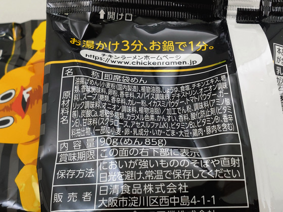 「ブラックチキンラーメン」のパッケージは黒色ベース。ひよこちゃんが「今だけだぞコノヤロー」と凄んできます。
