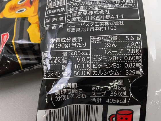 原材料名はこんな感じで、めんにスパイス調味料が含まれているほか、スープに香辛料、カレー粉、イカスミパウダーなどが使用されています。