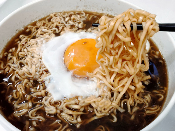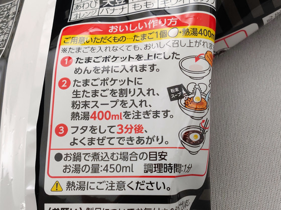 お好みで生卵をたまごポケットに投入し、粉末スープを入れて、お湯を注ぎます。