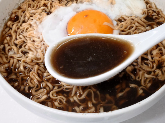 しっかりと混ぜれば完成。チキンラーメンのスープが黒いだけで、こんなにも違和感を抱くことになるとは思いませんでした。