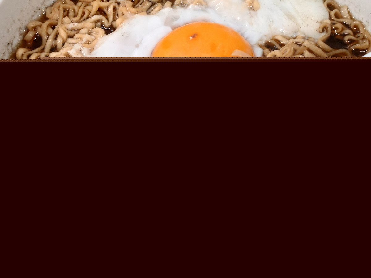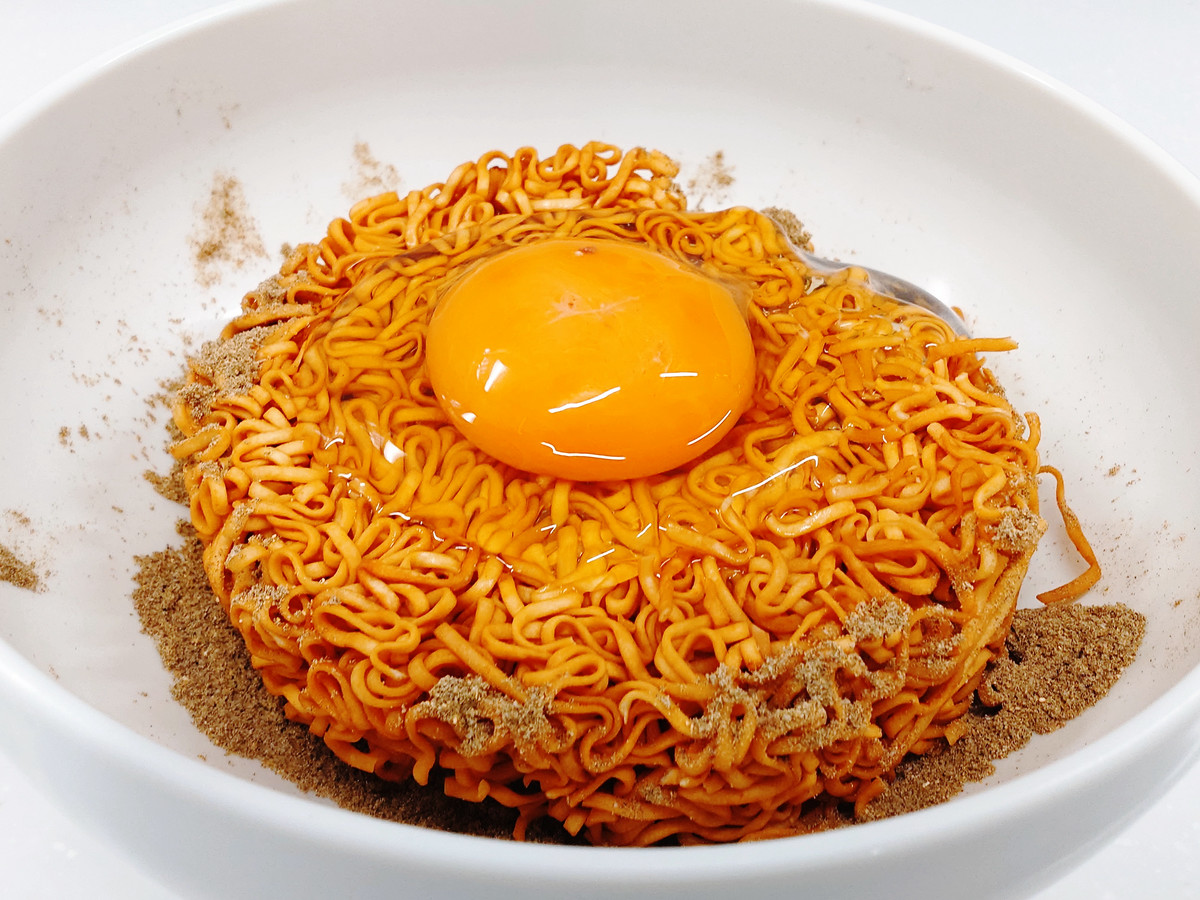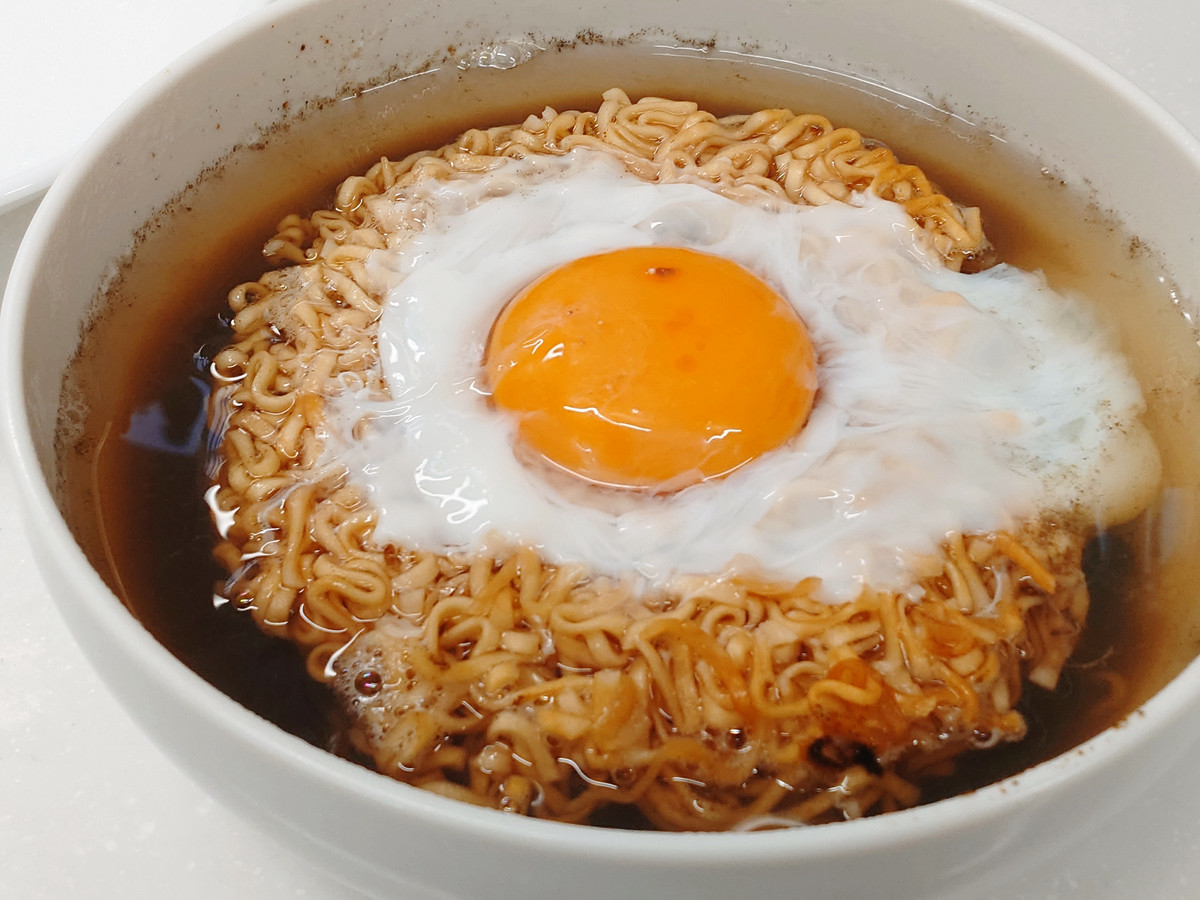 お好みで生卵をたまごポケットに投入し、粉末スープを入れて、お湯を注ぎます。