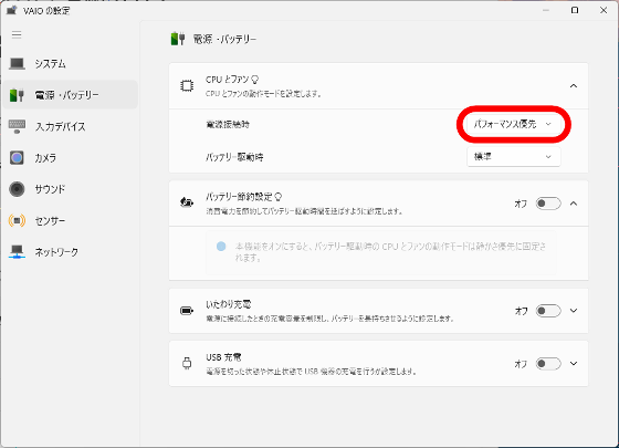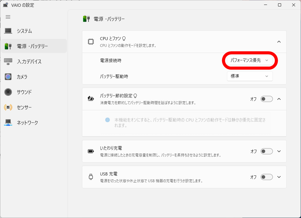 さらに、「VAIOの設定」という設定アプリでもCPUとファンのモードを「パフォーマンス優先」に切り替えています。