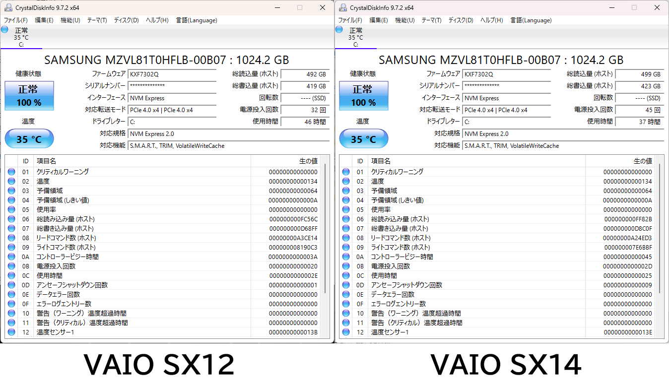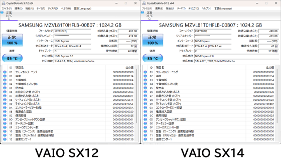 まずはストレージ性能を測定してみます。ストレージ情報を「CrystalDiskInfo」でチェックしてみたところ、どちらもPCIe 4.0に対応したSamsung製SSDを搭載していました。