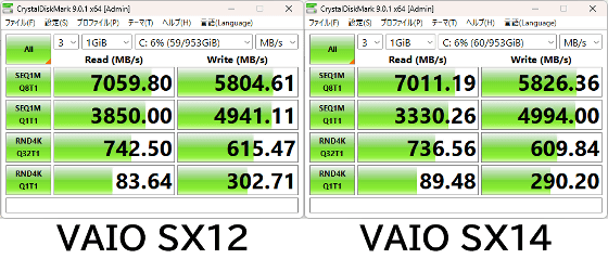 「CrystalDiskMark」でストレージ転送速度を測定した結果が以下。VAIO SX12はシーケンシャル読み込み速度が7059.80MB/s、シーケンシャル書き込み速度が5804.61MB/s、ランダム読み込み速度が742.50MB/s、ランダム書き込み速度が615.47MB/s。VAIO SX14はシーケンシャル読み込み速度が7011.19MB/s、シーケンシャル書き込み速度が5826.36MB/s、ランダム読み込み速度が736.56MB/s、ランダム書き込み速度が609.84MB/sでした。ほとんど同じ性能です。