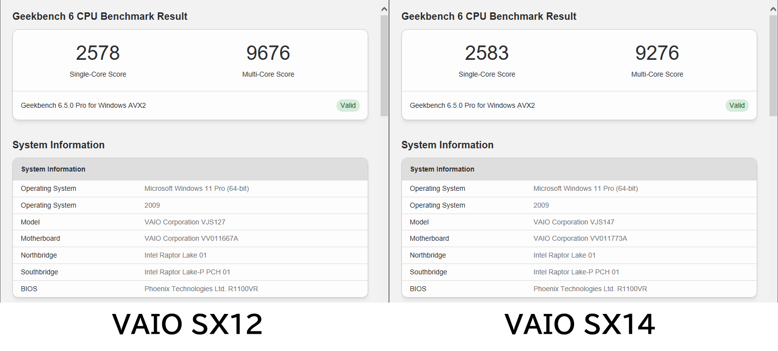 続いて、定番ベンチマークアプリ「Geekbench 6」のCPUテストを実行。シングルコアスコアはVAIO SX12が2578、VAIO SX14が2583でした。マルチコアスコアはVAIO SX12が9676で、VAIO SX14は9276です。
