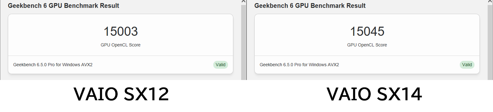 OpenCLでのGPUテストのスコアはVAIO SX12が1万5003で、VAIO SX14は1万5045。