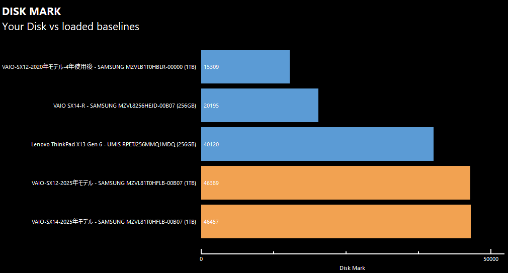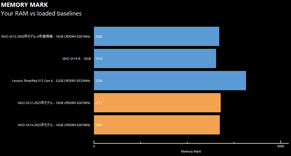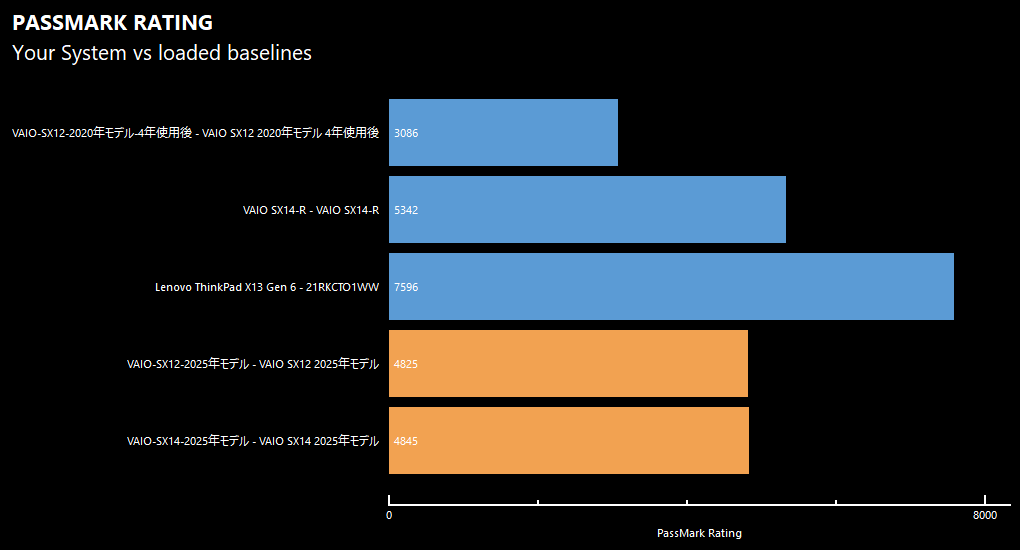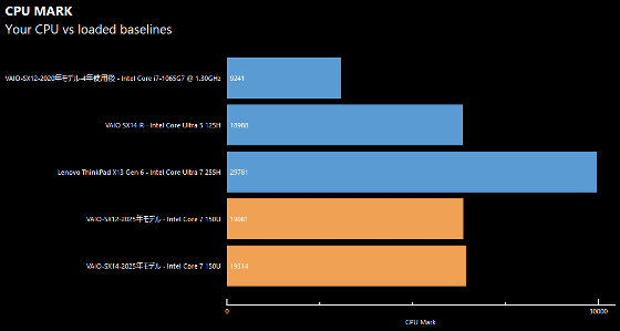 PCのカテゴリごとの性能を測定して他モデルと比較できるベンチマークアプリ「PassMark PerformanceTest」も実行しました。「VAIO SX12(2020年10月発売モデル)」「VAIO SX14-R」「ThinkPad X13 Gen 6」「VAIO SX12」「VAIO SX14」の総合スコアを並べた図が以下。2025年モデルのVAIO SX12とVAIO SX14は2020年モデルのVAIO SX12より大幅に高いスコアを記録しました。