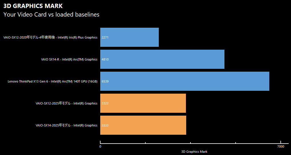 3DグラフィックではThinkPad X13 Gen 6に大きな差を付けられています。