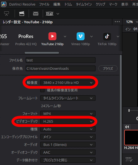 出力解像度を3840×2160ピクセルに設定してH.265でのエンコード処理を実行します。
