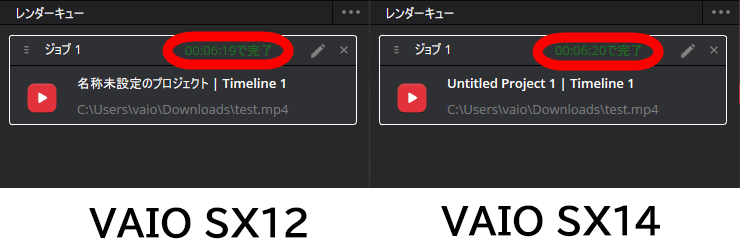 エンコードにかかった時間はVAIO SX12が6分19秒で、VAIO SX14が6分20秒でした。VAIO SX12とVAIO SX14はベンチマークテストだけでなく実際のPCタスクでもほとんど同じ性能を示すことが分かります。