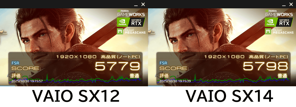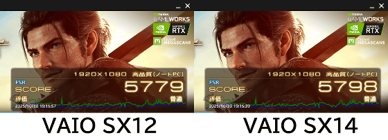 「ファイナルファンタジーXIV: 黄金のレガシー ベンチマーク」も実行。「1920×1080 高品質(ノートPC)」という設定でのスコアはVAIO SX12が5779で、VAIO SX14は5798。