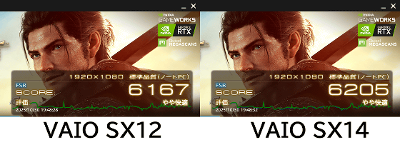「1920×1080 標準品質(ノートPC)」でのスコアはVAIO SX12が6167でVAIO SX14は6205でした。