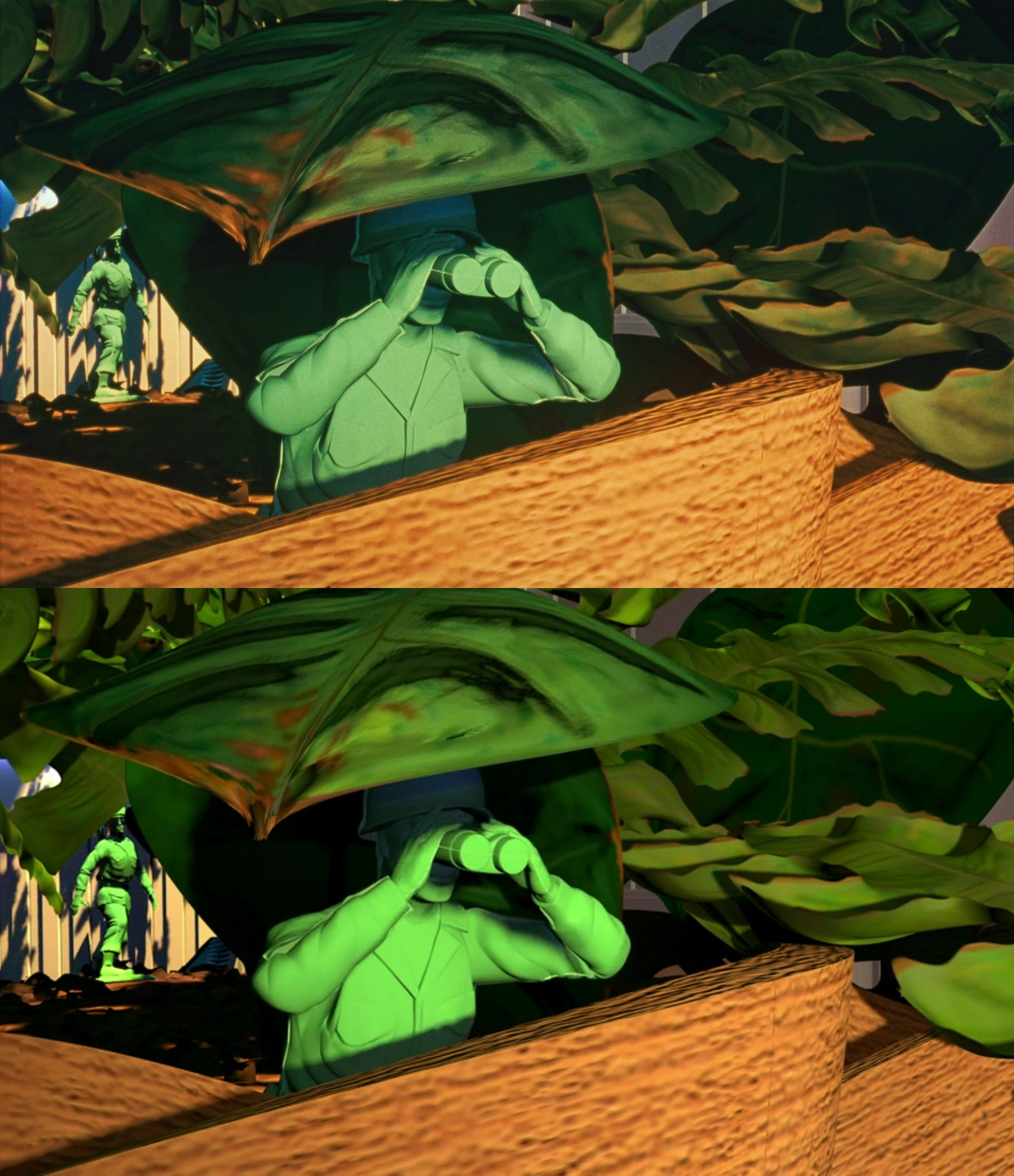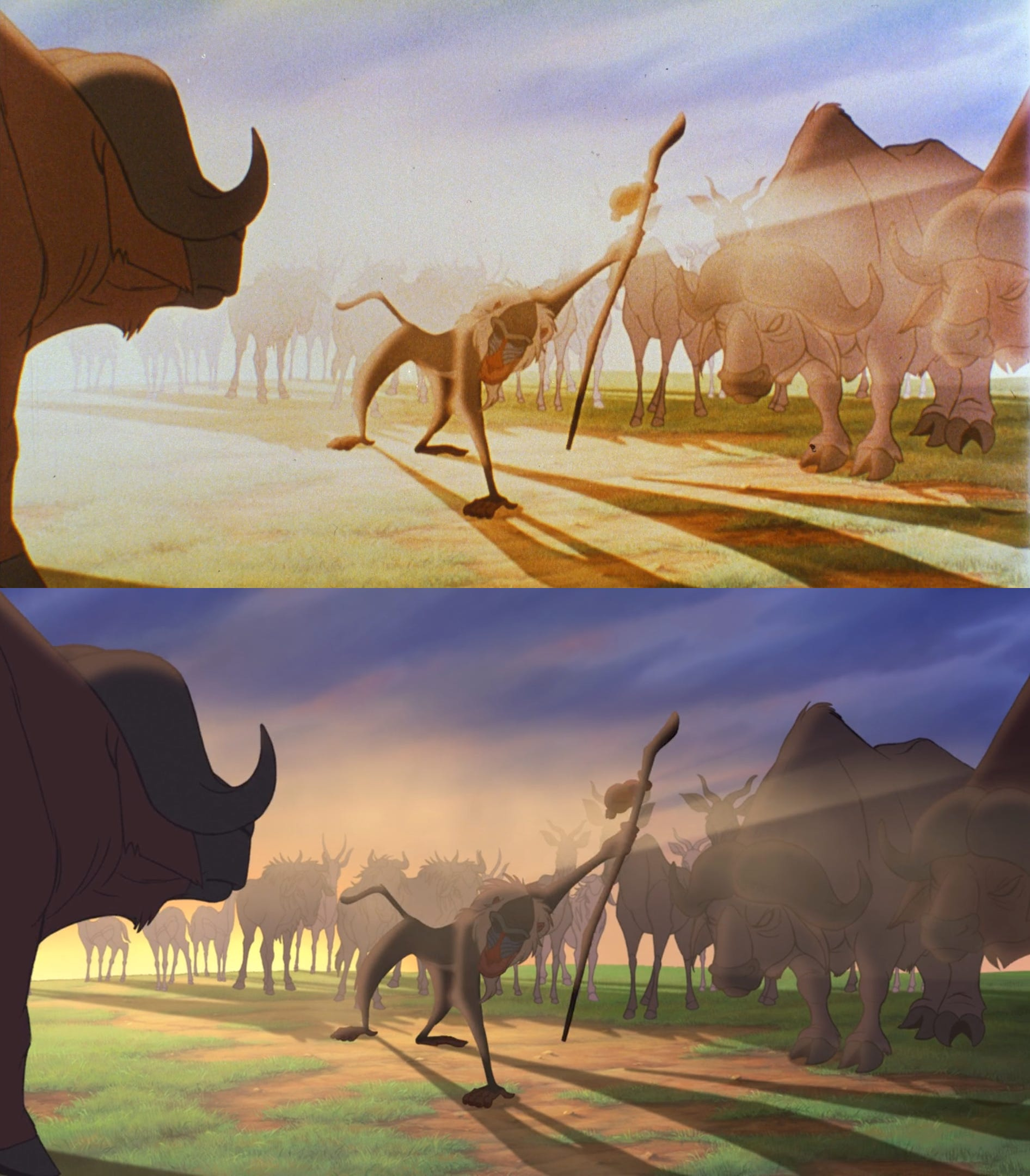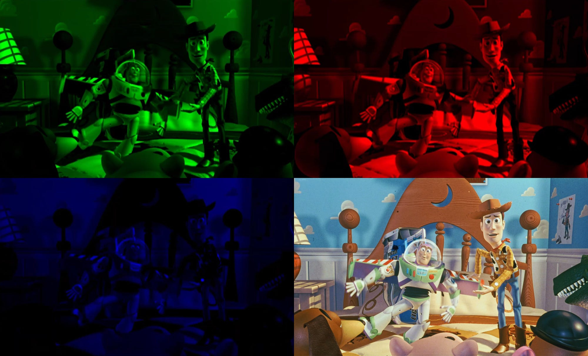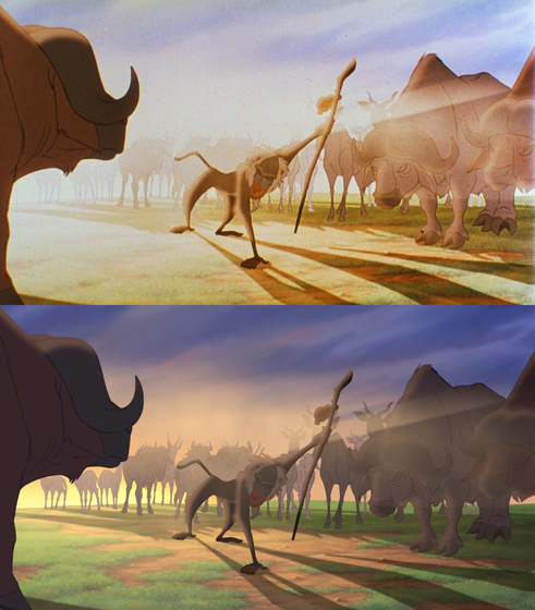 これは『トイ・ストーリー』に限らず、ディズニーの『アラジン』や『ライオン・キング』、『ムーラン』といった90年代の他の作品にも当てはまります。これらの作品も当時はフィルム上映を前提に制作されていたため、デジタルデータから直接作られた現在のバージョン(下)は、色彩などが劇場公開版(上)と大きく異なります。