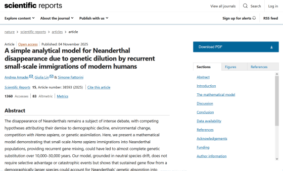 ヒト属の一種であるネアンデルタール人は約40万年前に現れ、ホモ・サピエンス(現生人類)と長らく共存していたものの、約4万年前に絶滅したといわれています。ネアンデルタール人が絶滅した原因には諸説ありますが、学術誌のScientific Reportsに掲載された新たな論文で、「ネアンデルタール人が消えたのは遺伝子が徐々にホモ・サピエンスへ吸収されていったから」という説が提唱されました。