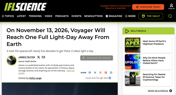 NASAが1977年に打ち上げたボイジャー1号は、木星と土星およびそれらの衛星などの観測を当初の目的としていましたが、これらの目的を果たした後も宇宙空間を進み続けています。科学系メディアのIFLScienceが、ボイジャー1号は2026年11月13日に「地球から丸1光日」離れた地点に到達すると解説しています。