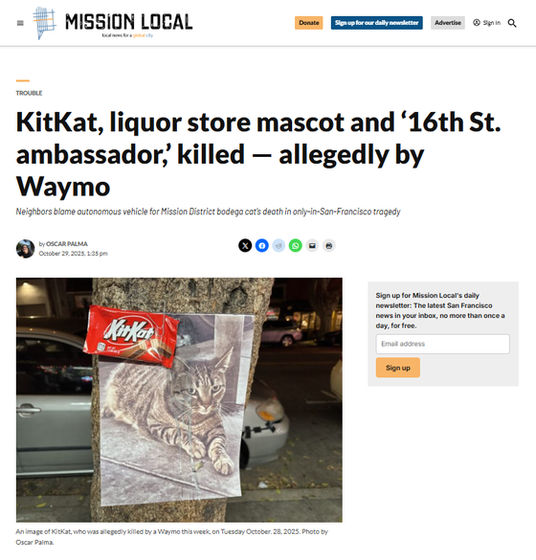 アメリカ・カリフォルニア州サンフランシスコのミッション地区にある酒屋の看板猫として地域の人々に愛されていた猫のキットカットが、Google発の自動運転タクシーであるWaymoの車両にひかれて死亡しました。地域住民からはWaymoへの批判の声が上がっています。