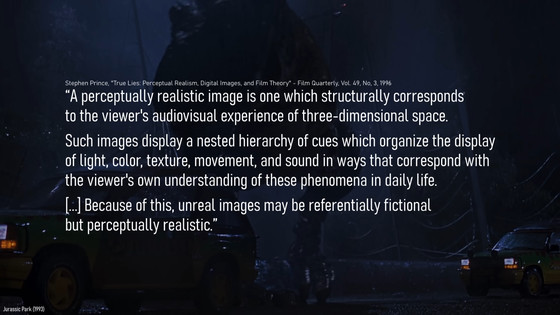 映画研究者のスティーブン・プリンス氏は「知覚的にリアルな映像とは、観客が三次元空間をどのように知覚し処理しているか、その構造に対応する映像である」と述べています。光や色、質感、動き、音といった手がかりが階層的に配置され、私たちの現実の理解に一致しているとき、たとえ映像が実在を写していなくても知覚的リアリズムが成立するというわけです。つまり、映像がその世界を私たちが普段と同じように知覚していると錯覚させるからリアルに感じるというわけです。