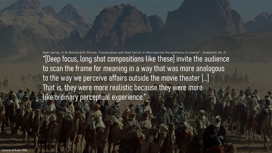 映画研究者のノエル・キャロル氏は、被写界深度を深く取った構図は「映画館の外で私たちが世界を知覚する方法に近く、よりリアルに感じられる」と述べています。これは画面の中にある情報の内容そのものより、観客がどう映像と関わるかという形そのものを重視した考え方です。そのため、この議論はフィルム撮影かデジタル撮影かという古い対立とは別である、とリンデン氏。