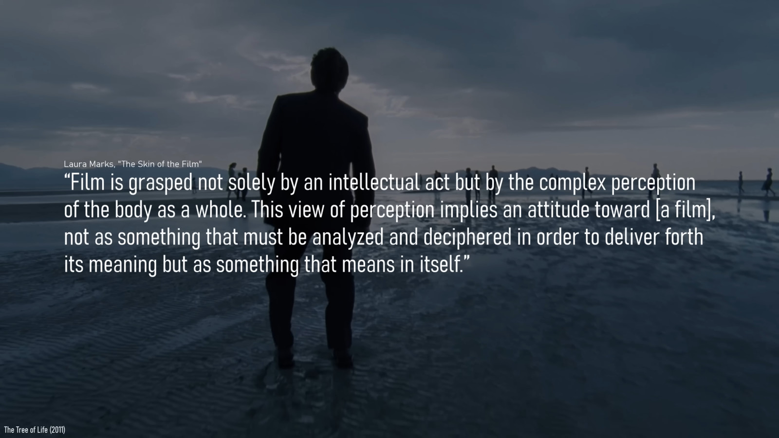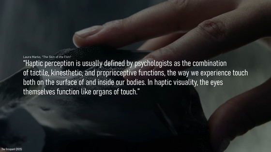 マークス氏は、「映画は視覚と聴覚だけではなく、触覚や身体感覚にも作用する」と述べ、目が触れる感覚を持つかのように映像を知覚する「触覚的視覚性」を提唱しました。これは奥行きを把握する通常の視覚とは異なり、質感や表面の手触りを感じ取るような視覚です。