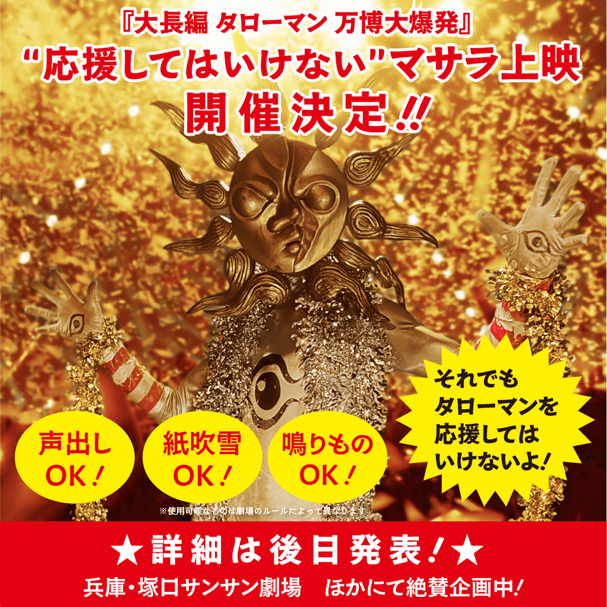 映画『大長編 タローマン 万博大爆発』の「応援してはいけないマサラ上映」開催が決定しました。映画を見ながら声を出して登場キャラクターらを応援する「応援上映」はかなり定着してきた感がありますが、本作の場合、タローマンは応援されるとダメになってしまうため「応援してはいけない」上映となっています。そこに、紙吹雪OK・鳴り物OKのマサラ形式が組み合わさるとなると大変べらぼうなイベントとなるのではないでしょうか。詳細は後日発表だとのことです。